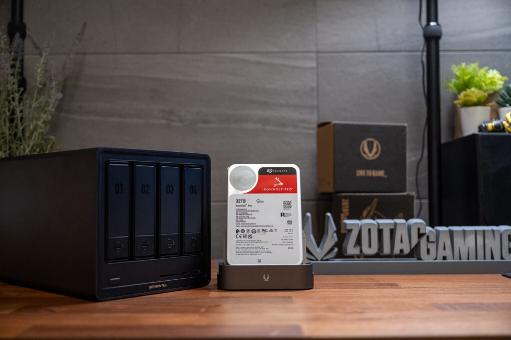 ストレージには、コンシューマ向け市場で最大級となるSeagate IronWolf Pro 32TBを4台使用しました。NAS向けに設計されたこのHDDは、7200RPM、最大285MB/sの転送速度を誇ります。